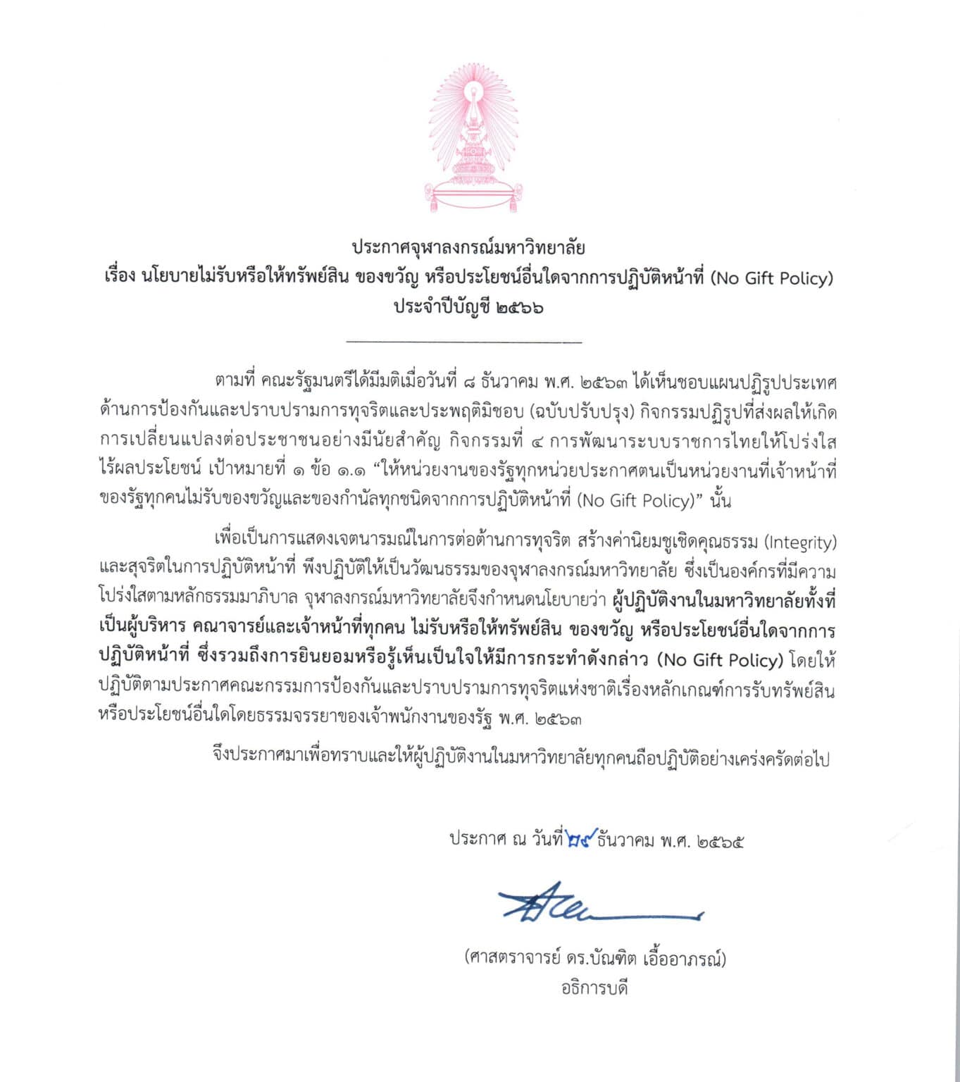 ด้วยเหตุนี้ เมื่อวันที่ 18 ธันวาคม 2568 จุฬาลงกรณ์มหาวิทยาลัยจึงได้ประกาศ “นโยบายไม่รับของขวัญและของกำนัลทุกชนิดจากการปฏิบัติหน้าที่” (No Gift Policy) ประจำปีงบประมาณ 2569 เพื่อแสดงเจตนารมณ์อย่างแน่วแน่ในการต่อต้านการทุจริต ป้องกันความขัดแย้งทางผลประโยชน์ และยกระดับมาตรฐานการบริหารงานตามหลักธรรมาภิบาลและแนวปฏิบัติสากล