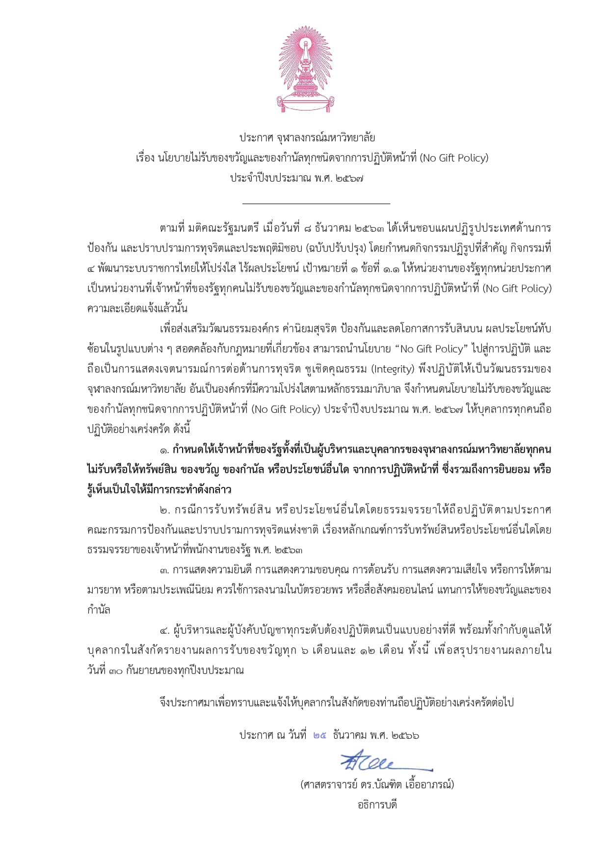 จุฬาลงกรณ์มหาวิทยาลัยได้เผยแพร่ประกาศ จุฬาลงกรณ์มหาวิทยาลัย เรื่อง “นโยบายไม่รับของขวัญและของกำนัลทุกชนิดจากการปฏิบัติหน้าที่ (No Gift Policy) ประจำปีงบประมาณ พ.ศ. 2567” ลงวันที่ 26 ธันวาคม 2566 ซึ่งมีเนื้อหาในประกาศดังนี้
